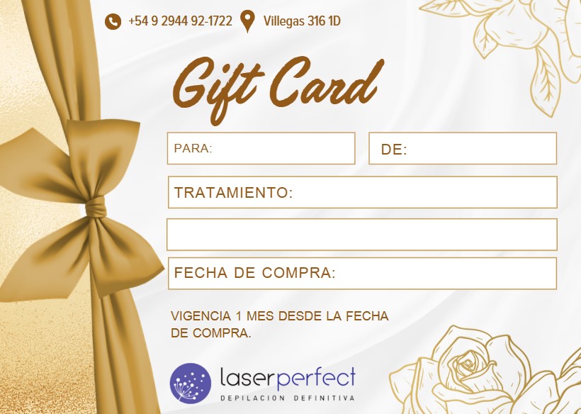 Sorprendé a esa persona especial con una experiencia única en Laser Perfect. Nuestras Gift Cards son el regalo ideal para cualquier ocasión: podés elegir el monto y quien la reciba podrá usarla en cualquiera de nuestros tratamientos.